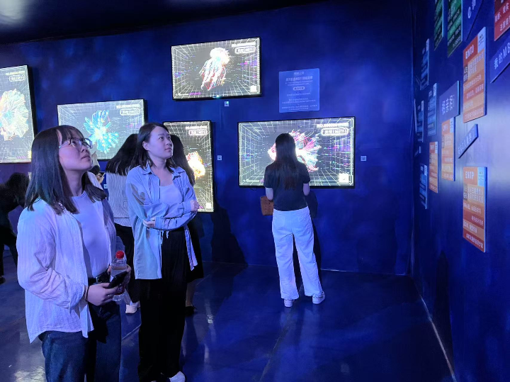 活动首站,青年们来到了“无限之海——沉浸式AI数字艺术展”,通过AI数字艺术、交互艺术、装置艺术等多种艺术形式,沉浸式领略AI和数字多媒体技术。