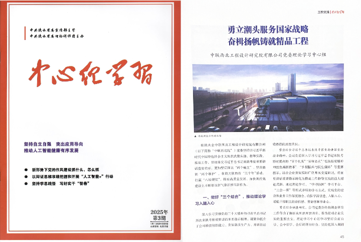 近日,由省委宣传部主管、省委理论讲师团主办的《中心组学习》杂志在2025年第3期刊发了国机集团中联西北院党委理论学习中心组文章《勇立潮头服务国家战略 奋楫扬帆铸就精品工程》,现将全文刊载如下。
