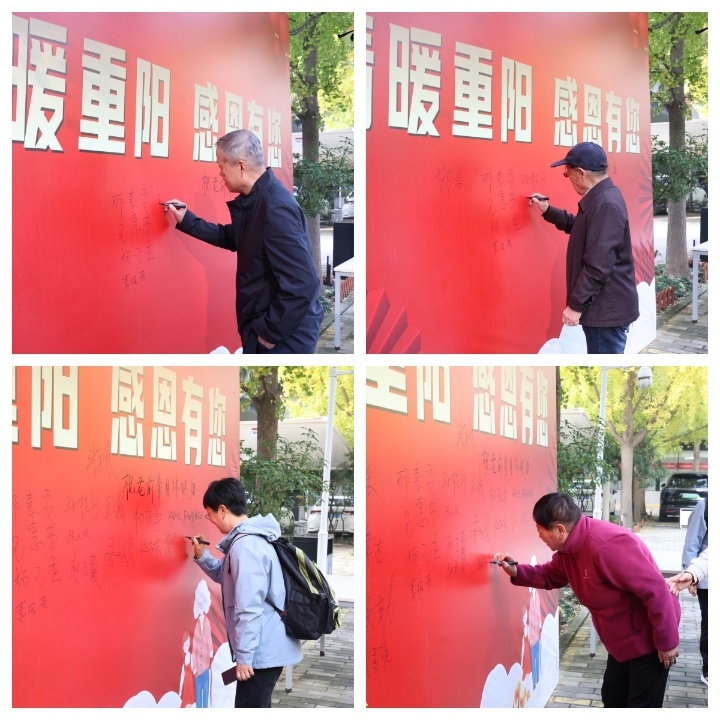 上午九点,暖阳初上,银杏金黄,志愿者们早已全部准备就绪,迎接着老同志的到来。在“情暖重阳,感恩有您”签字墙上,老同志们打卡留念,留下了温馨的场景。