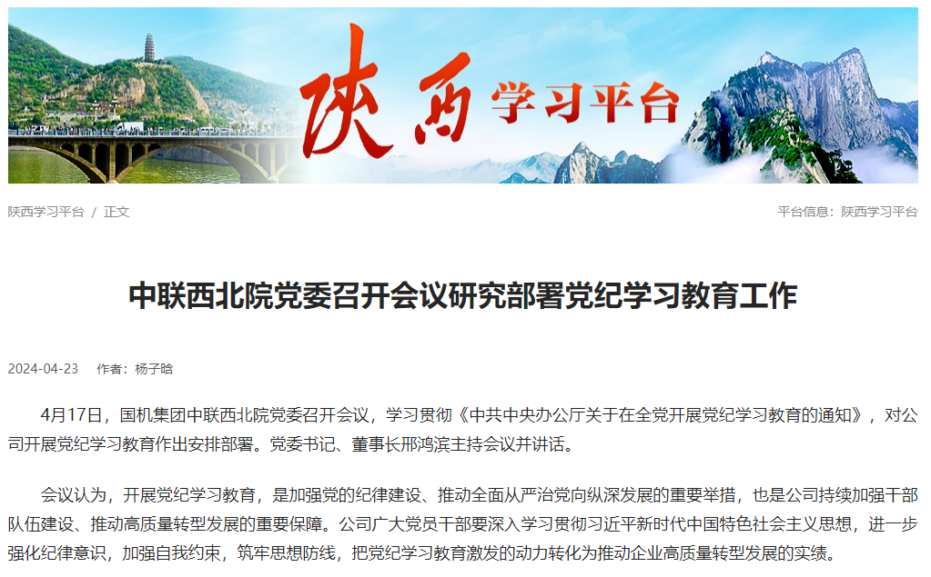 2024年4月23日,“学习强国”陕西平台刊登了《中联西北院党委召开会议研究部署党纪学习教育工作》,报道了中联西北院全面部署党纪学习教育的有力举措。
