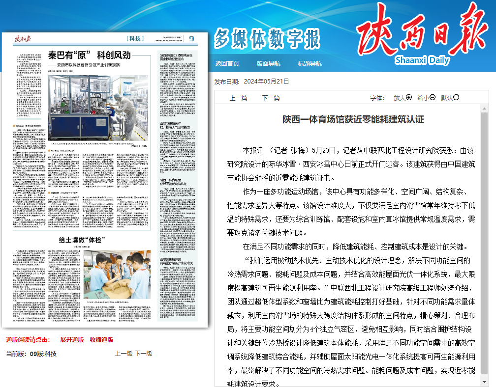 2024年5月21日,陕西日报报道:由中联西北院设计的际华冰雪·西安冰雪中心日前正式开门迎客。该建筑获得由中国建筑节能协会颁授的近零能耗建筑证书。