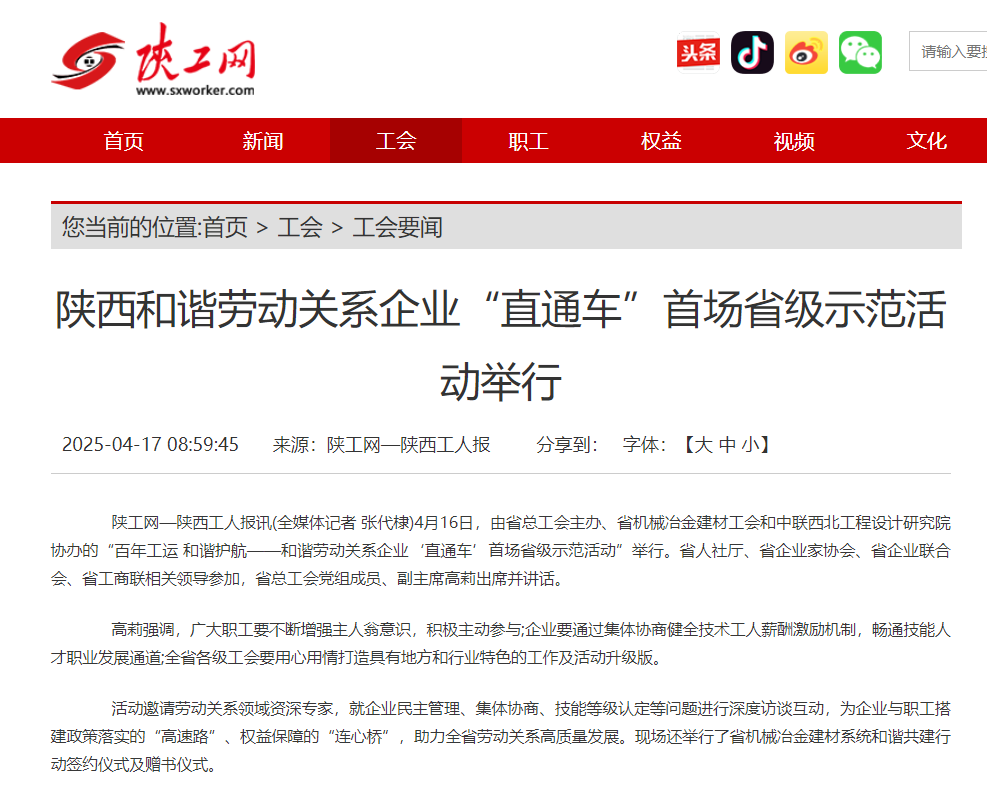 2025年4月7日,陕工网报道了陕西和谐劳动关系企业“直通车”首场省级示范活动举行,本次活动由省总工会主办、省机械冶金建材工会和中联西北工程设计研究院有限公司协办。