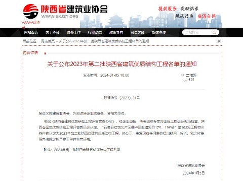 1月5日,陕西省建筑业协会发布了《关于公布2023年第二批陕西省建筑优质结构工程名单的通知》,中联西北院所属华建公司承接的保利锦上璟悦一批次、西安宜家购物中心项目(一期) 监理项目荣获“2023年第二批陕西省建筑优质结构工程”。