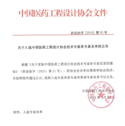 近日,中国医药工程设计协会发布了《关于入选中国医药工程设计协会技术专家库专家名单的公告》。经协会会员单位推荐、协会专业评审及网络公示等环节,中联西北院张益、王倩入选中国医药工程设计协会技术专家库。