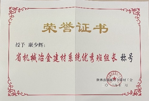第一工程公司康少辉被授予陕西省机械冶金建材系统优秀班组长荣誉称号。