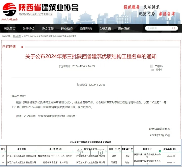 日前,陕西省建筑业协会发布《关于公布2024年第三批陕西省建筑优质结构工程名单的通知》(陕建协发〔2024〕29号)。其中,由国机集团中联西北院承揽的桂语晴澜项目荣获陕西省“优质结构工程”荣誉称号。