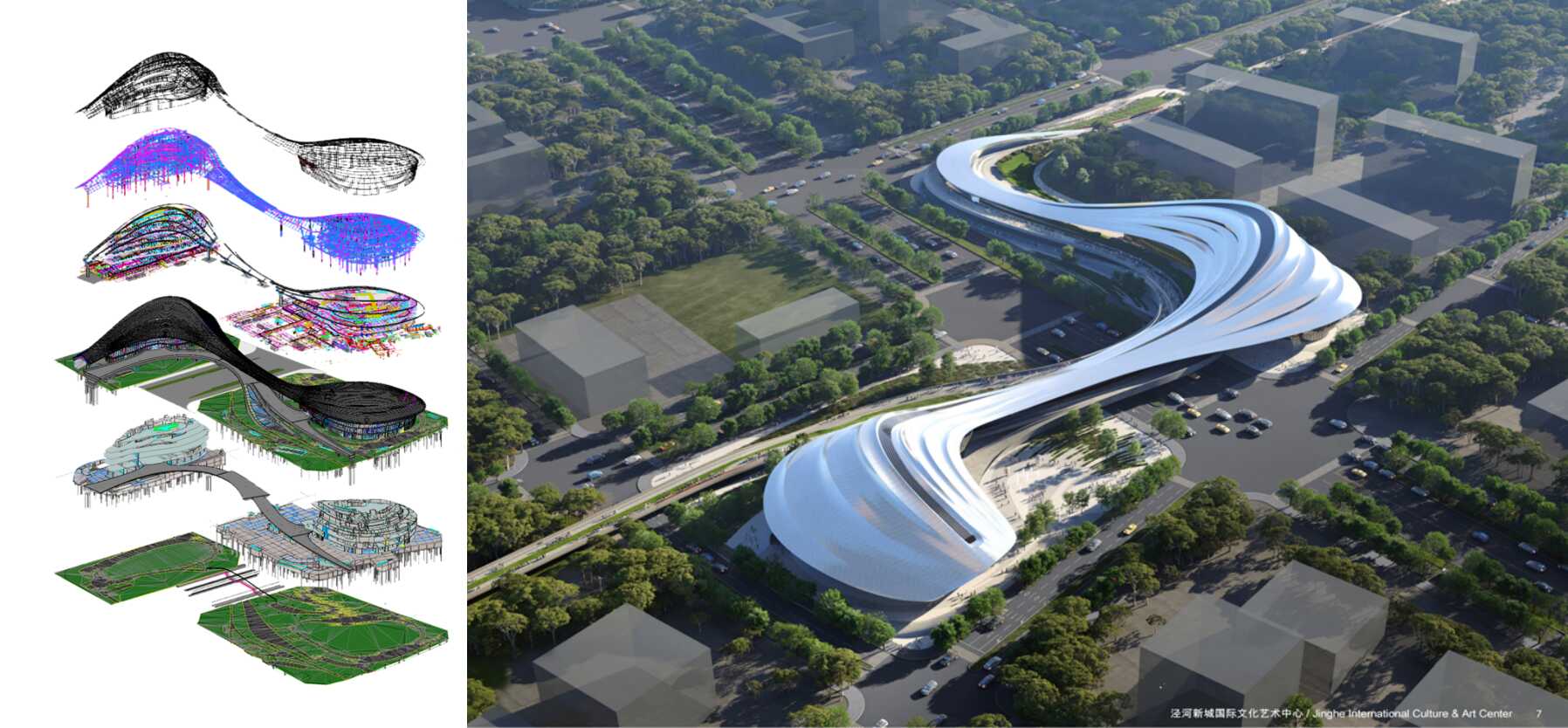 该项目坐落于西咸新区泾河新城,总建筑面积5.67万平方米,涵盖一期北地块图书馆、二期南地块艺术中心以及景观步行桥等配套设施。以中联西北院管理标准文件为依托,结合项目自身特点,制定BIM总体实施路径,同时编制《BIM实施方案》,明确工作流程机制以及各阶段BIM应用点,系统地建立了应用标准体系,并严格应用于项目实施过程。实现了方案阶段的“正向设计”、施工图阶段的“正向伴随”以及深化阶段的“正向辅助设计”,实现建设过程的数字化。
