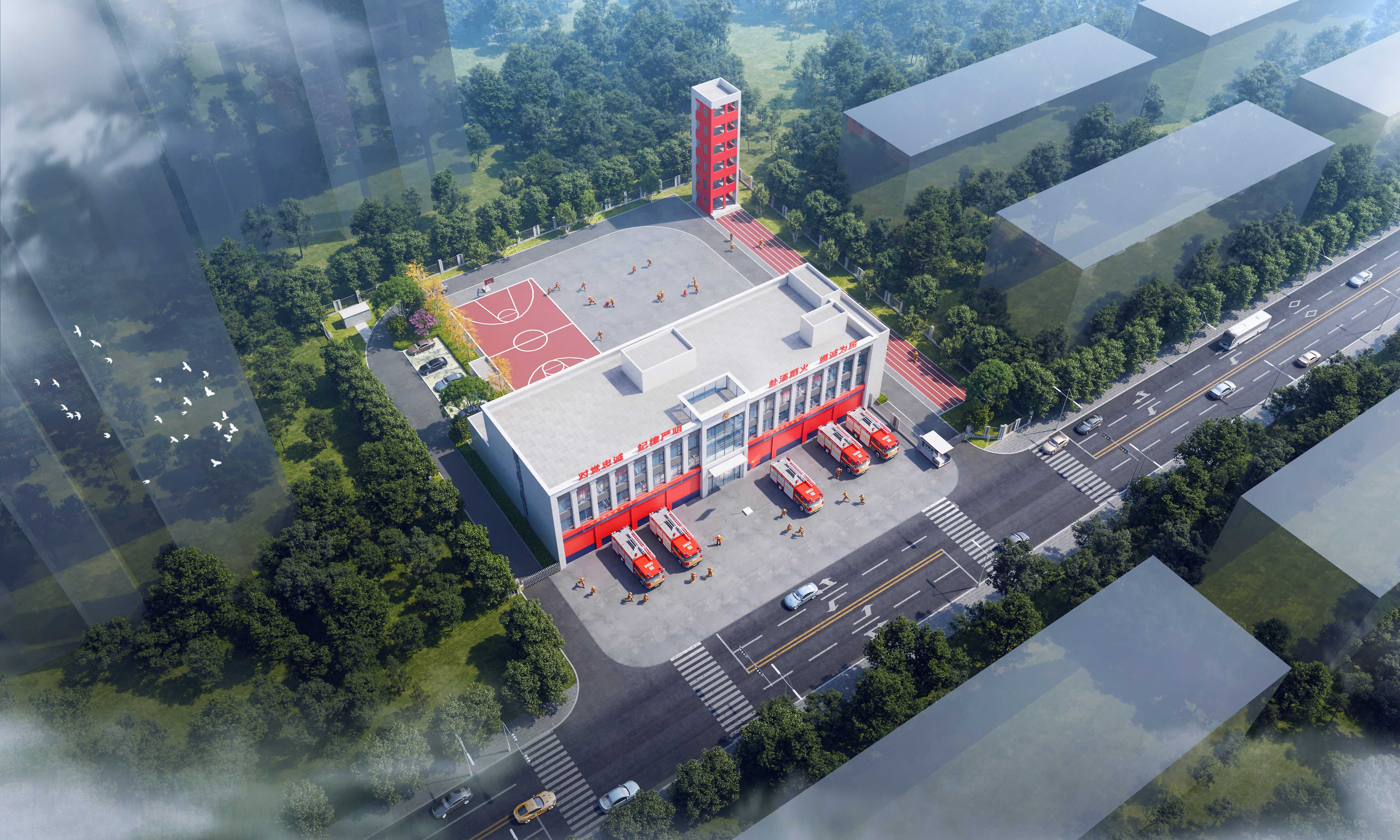 项目位于陕西省西安市雁塔区,用地面积约9.438亩。遵循“一键出动”的核心流线,“模块化”的标准设计思维,以人为本的“身心健康”空间营造,旨在打造一座响应高效、训练有素、生活宜居、形象威严的现代化消防救援站。