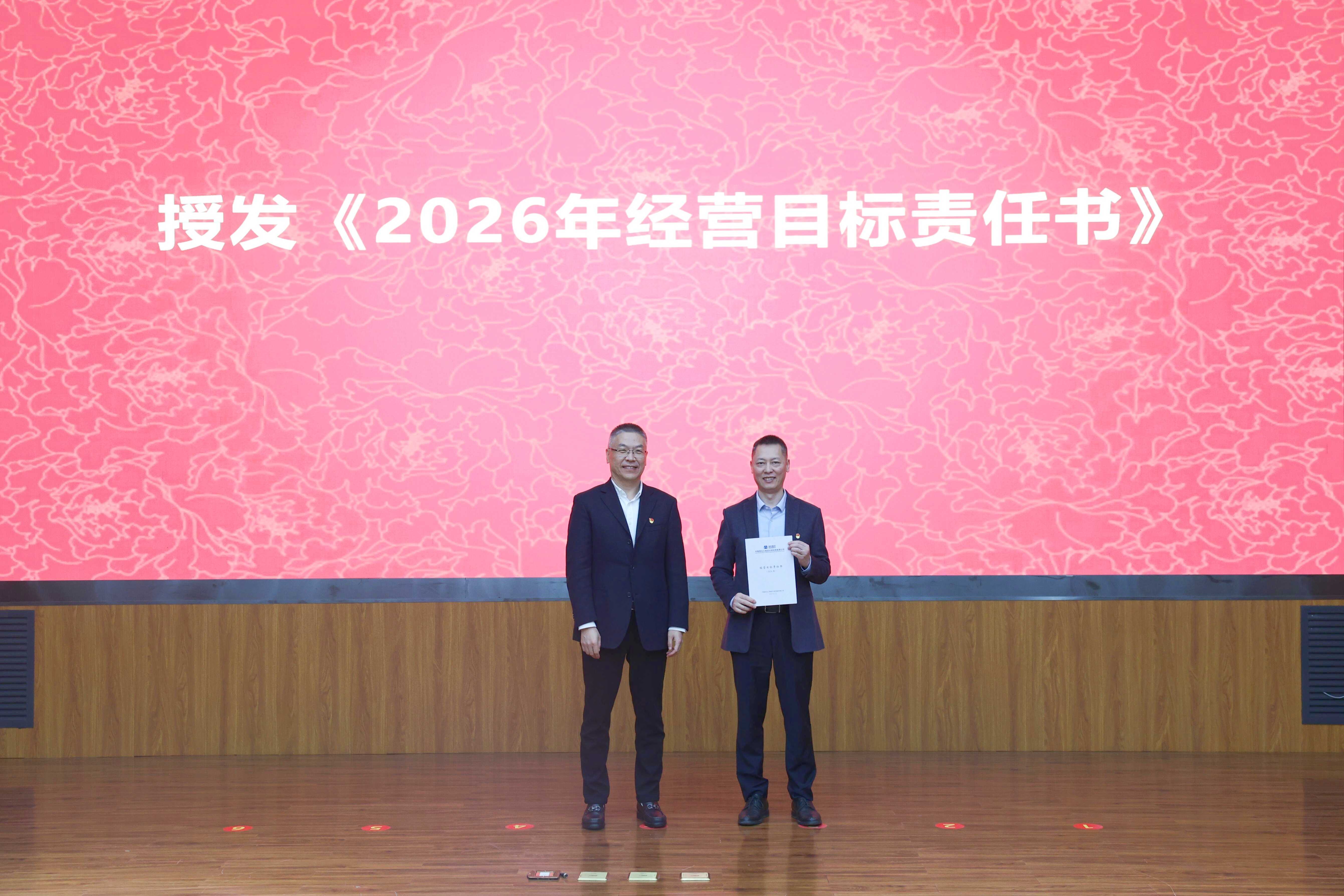▲赵光杰向党委副书记、总经理唐振宇授发《经营目标责任书》