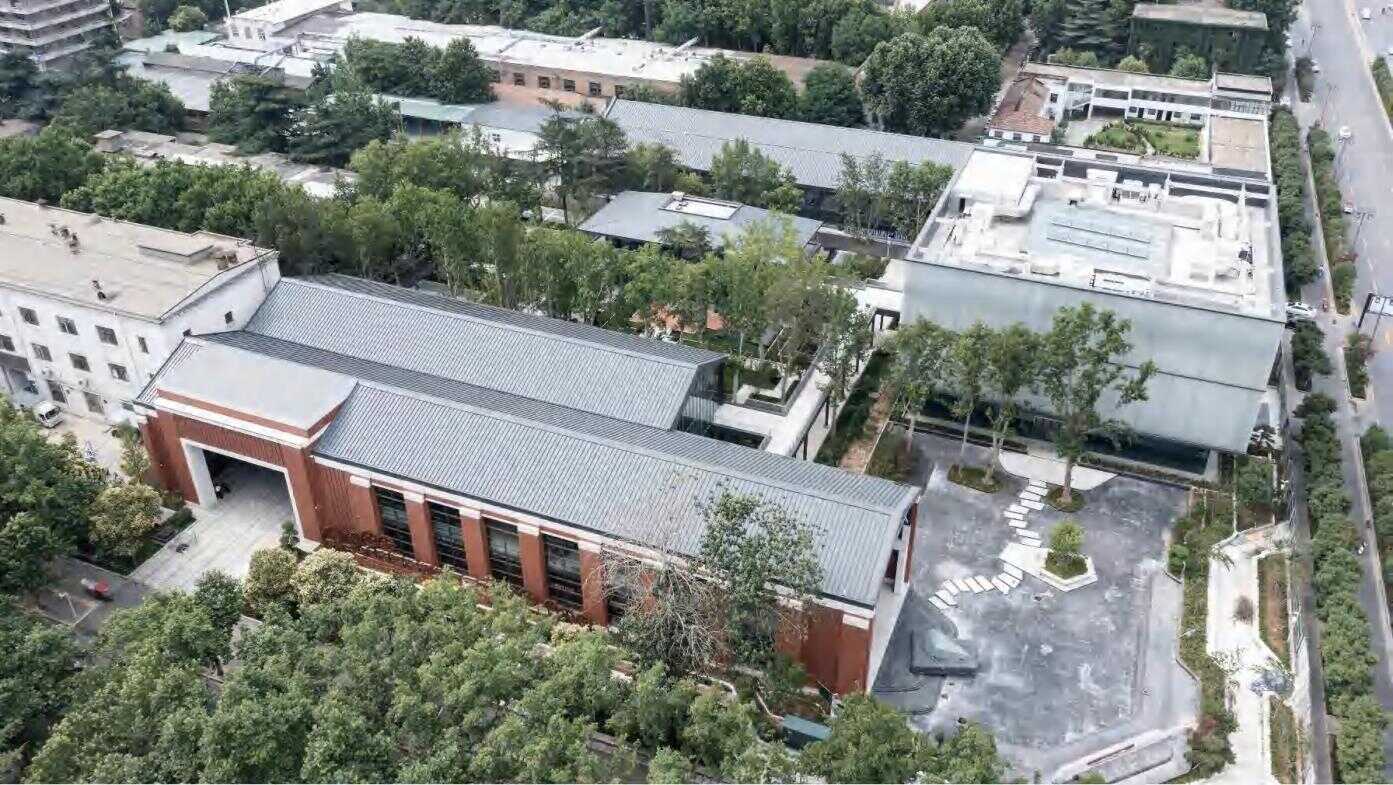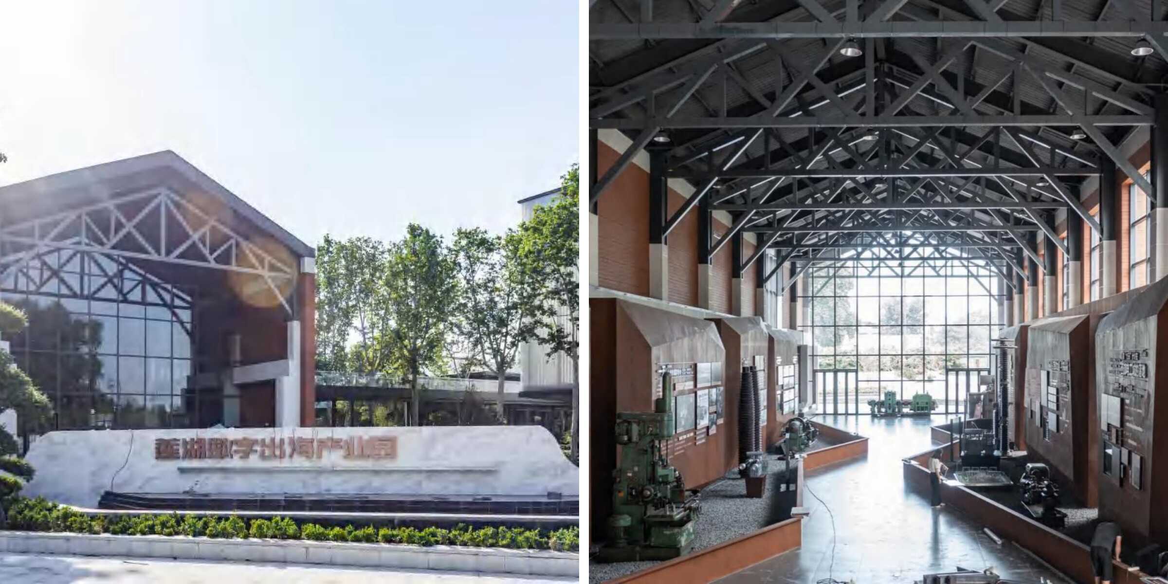 在复杂的周边环境中,以“改造+保护+新建“的针对性策略,注入场地新活力,赋予建筑新生命。保留50年代“苏式”厂房尖顶、法国梧桐及工业管道等历史符号,改造时光长廊、空中生态连廊等公共空间,新建数字沙盘馆、标准化直播间等产业载体,精准激活场地记忆与功能,实现“修旧如旧、新旧共生”的有机更新。
