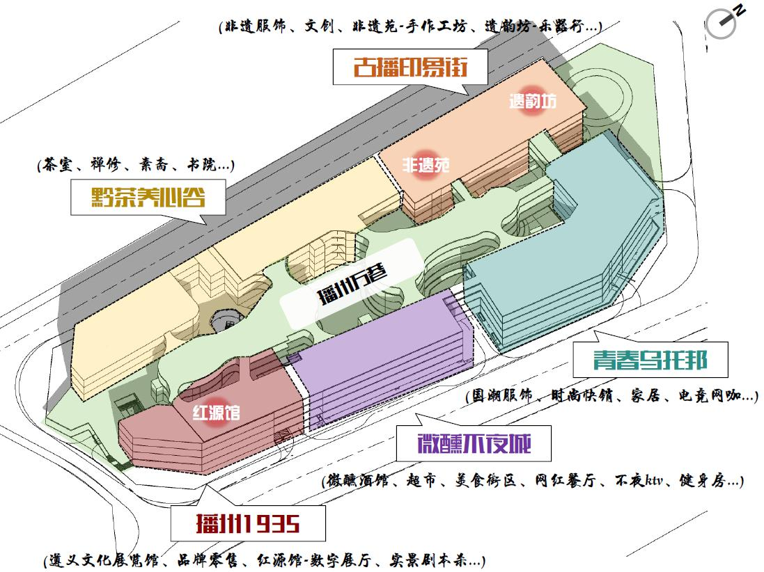 项目位于贵州省遵义市播州区,改造商业区总用地面积约57亩,改造商业区总建筑7万平方米,旨在提升区域商业氛围,完善城市功能。项目计划对现有商业设施进行全面升级改造,包括建筑立面更新、内部空间优化、公共设施改善等,以打造现代化、特色化的商业环境。项目践行“策、产、投、建、营”经营模式,以策划作为项目切入点,中标项目策划及设计咨询服务,正向赋能全过程咨询,构建地域文旅体验型商业街区—播州里。