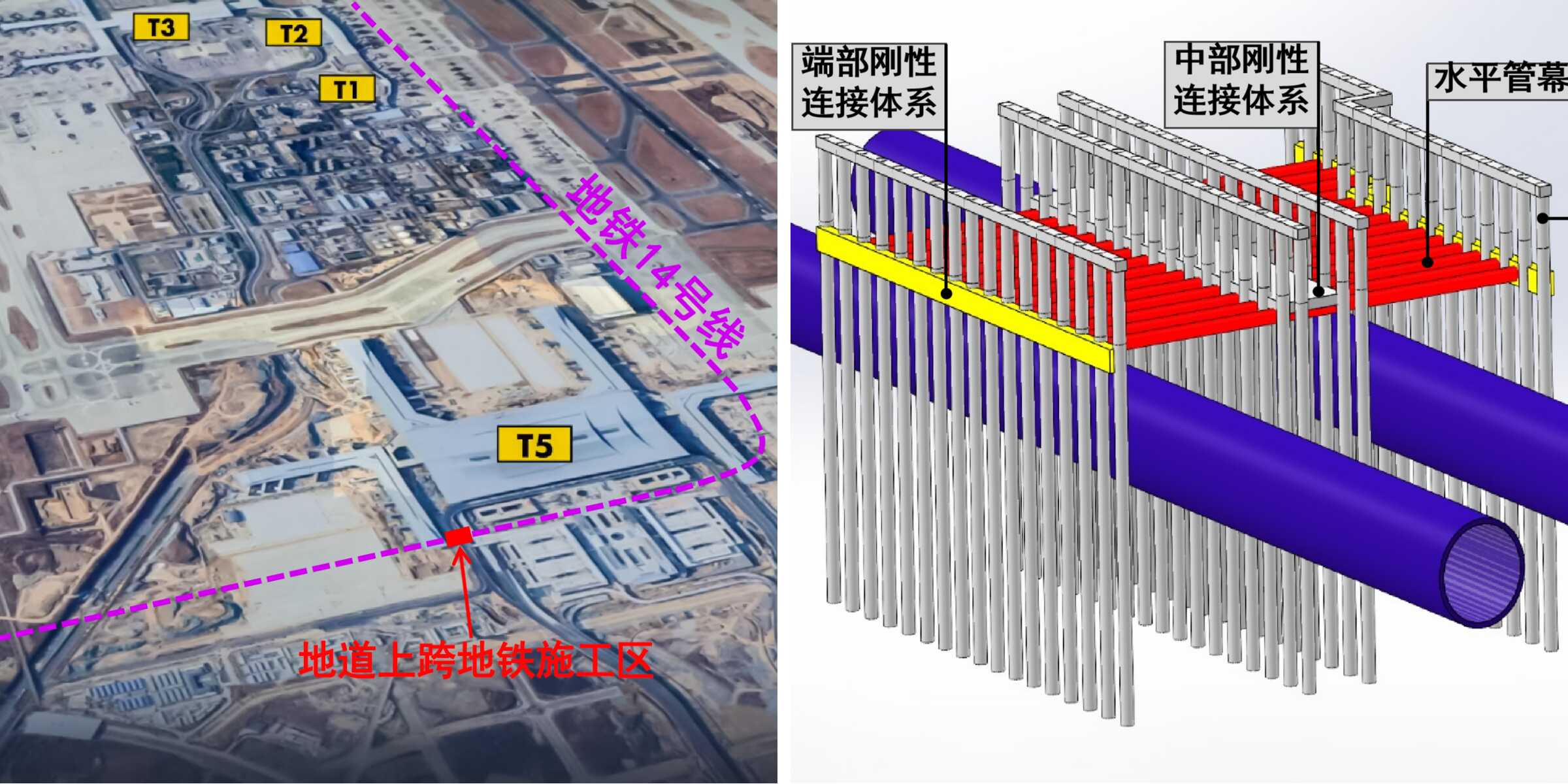 其中综合交通枢纽地下空间开发中,面临新建地道近距上跨已运营地铁14号线,隧道上部若直接开挖卸载,将引起隧道变形超限,危及地铁运营安全。