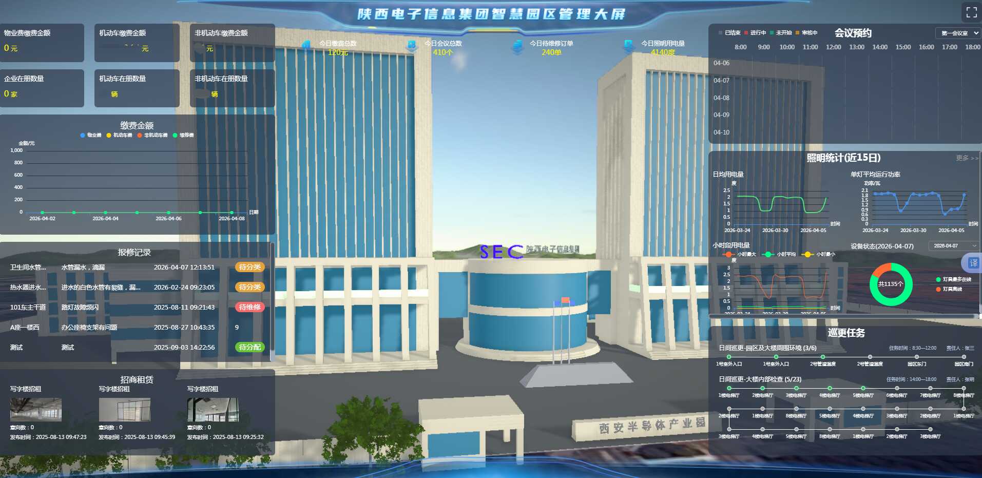 以园区管理精细化、运营管理可视化为核心,全面赋能园区管理决策科学化、数据化。平台实时汇聚费用收缴统计数据,直观呈现缴费进度与收缴动态,实现收支情况一目了然;集成线上报修、招商租赁、会议预约等高频核心场景,一站式满足园区运营管理与企业服务需求。