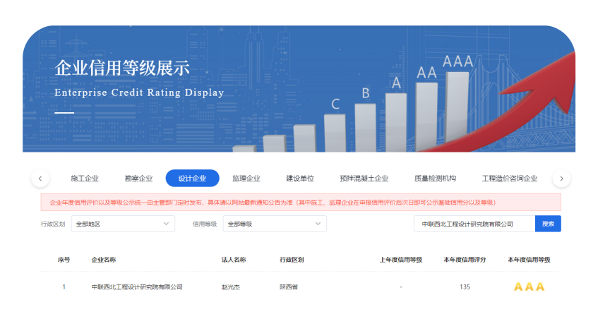 新疆维吾尔自治区住房和城乡建设厅于4月17日正式公布2025年上半年建筑行业市场设计企业信用评价结果,中联西北院凭借稳健经营、优质履约与良好口碑,获得年度信用评分135分(AAA 级)信用评分,位居在疆设计企业信用等级第一梯队(其中2833家参评,仅61家获AAA)。