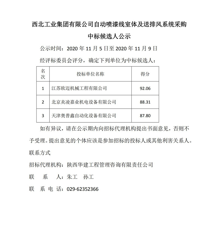 西北工业集团有限公司自动喷漆线室体及送排风系统采购中标候选人公示