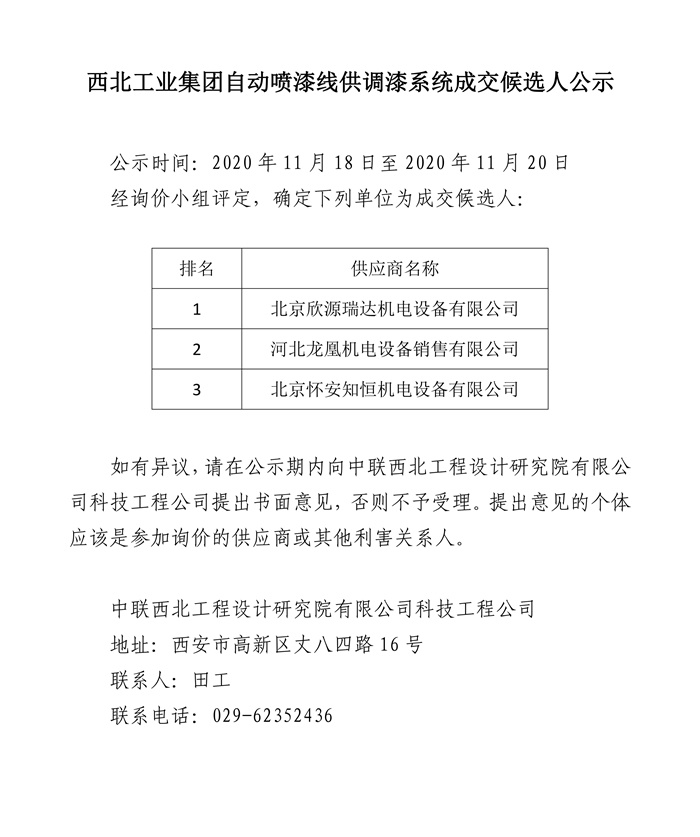 西北工业集团自动喷漆线供调漆系统成交候选人公示