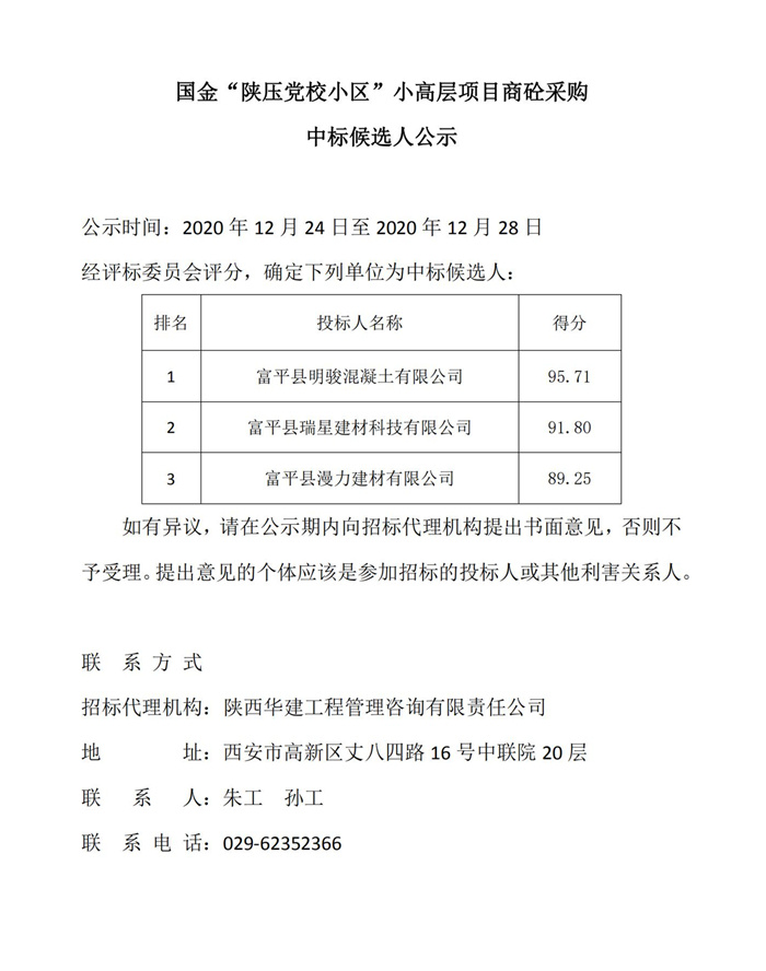 国金“陕压党校小区”小高层项目商砼采购中标候选人公示