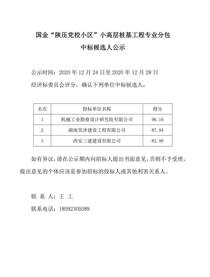 国金“陕压党校小区”小高层桩基工程专业分包中标候选人公示