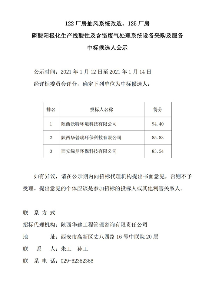122厂房抽风系统改造、125厂房磷酸阳极化生产线酸性及含铬废气处理系统设备采购及服务中标候选人公示