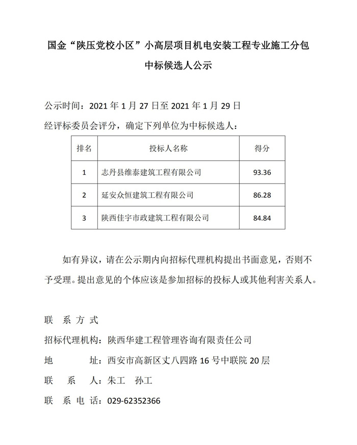 国金“陕压党校小区”小高层项目机电安装工程专业施工分包中标候选人公示