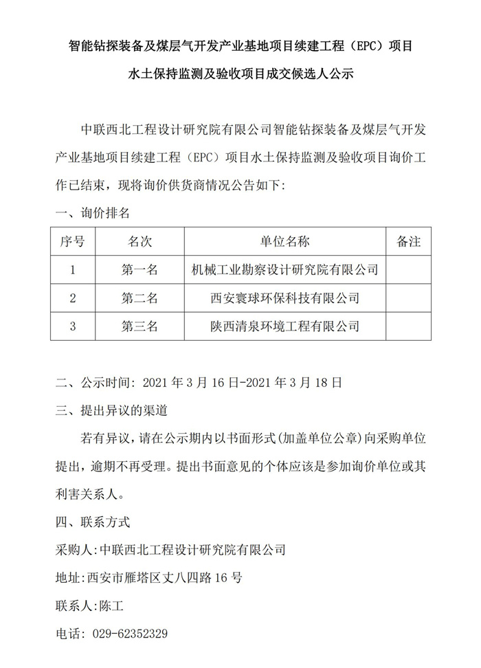 智能钻探装备及煤层气开发产业基地项目续建工程(EPC)项目水土保持监测及验收项目成交候选人公示