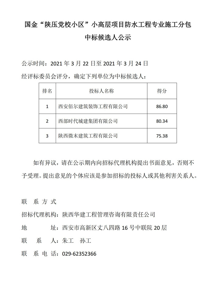 国金“陕压党校小区”小高层项目防水工程专业施工分包中标候选人公示