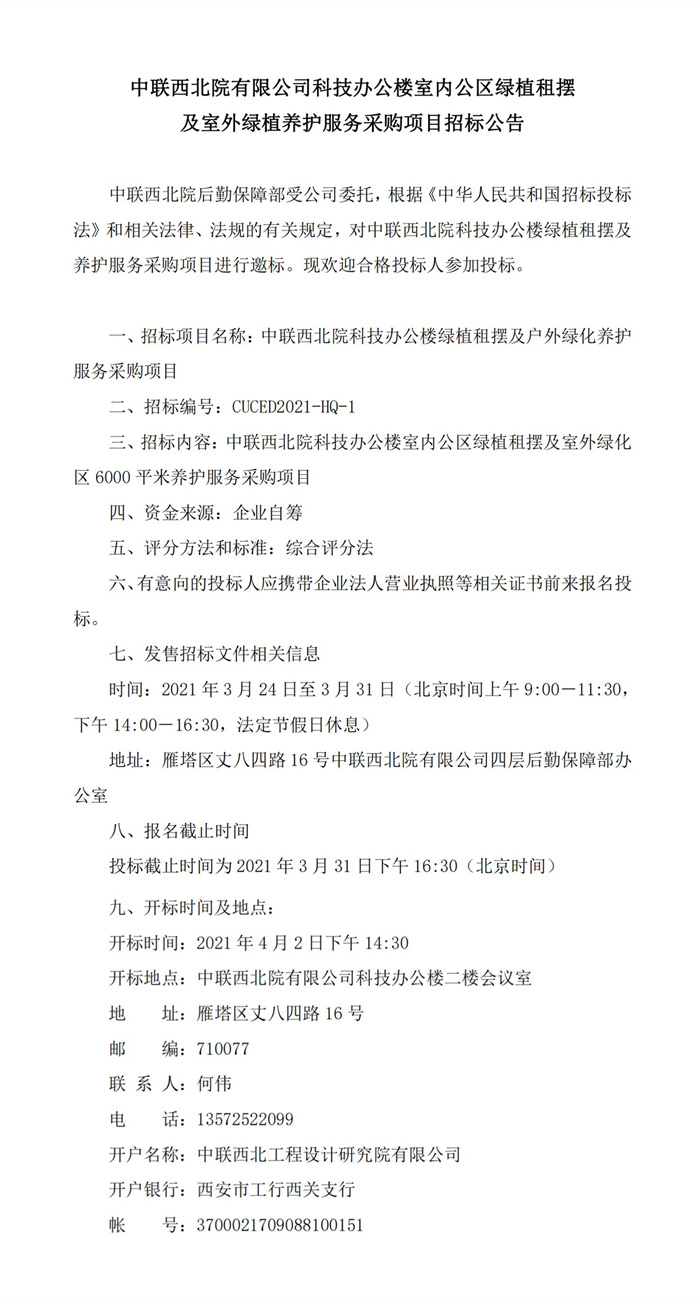 中联西北院有限公司科技办公楼室内公区绿植租摆及室外绿植养护服务采购项目招标公告
