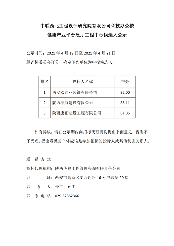 中联西北工程设计研究院有限公司科技办公楼健康产业平台展厅工程中标候选人公示