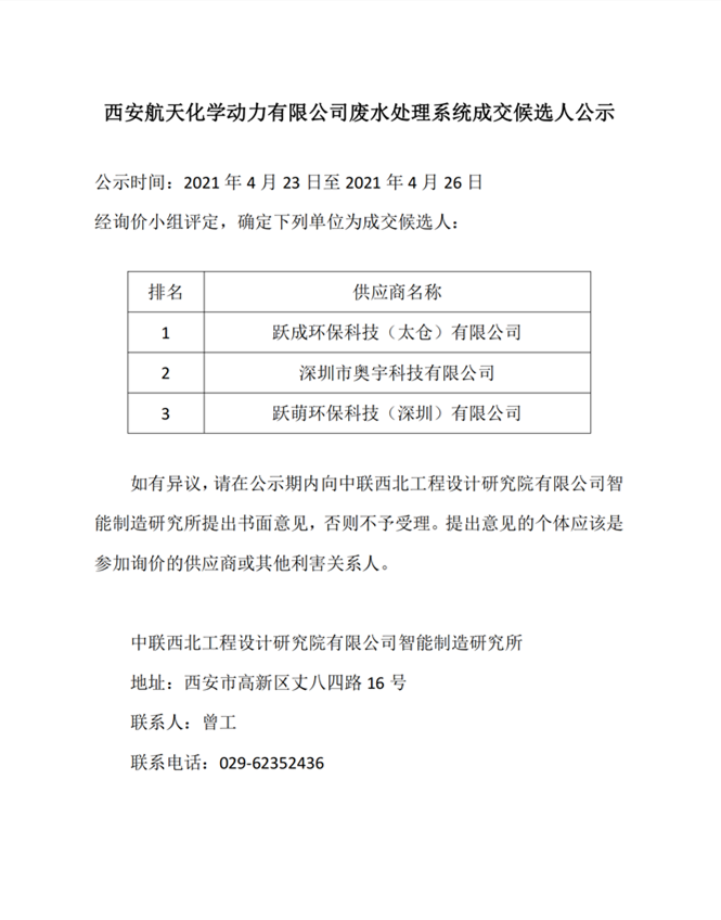 西安航天化学动力有限公司废水处理系统成交候选人公示