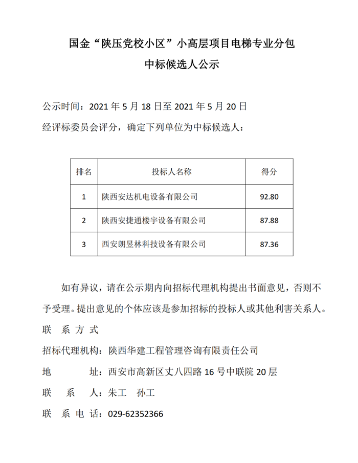 国金“陕压党校小区”小高层项目电梯专业分包中标候选人公示