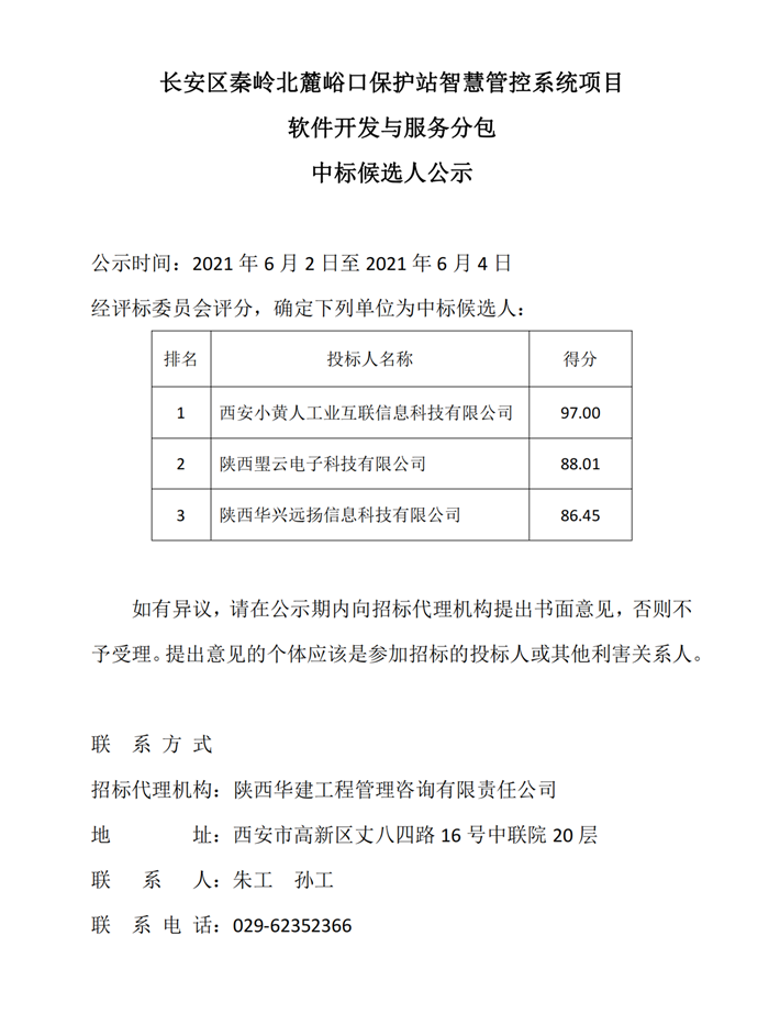 长安区秦岭北麓峪口保护站智慧管控系统项目软件开发与服务分包中标候选人公示