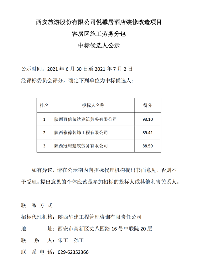 西安旅游股份有限公司悦馨居酒店装修改造项目客房区施工劳务分包中标候选人公示
