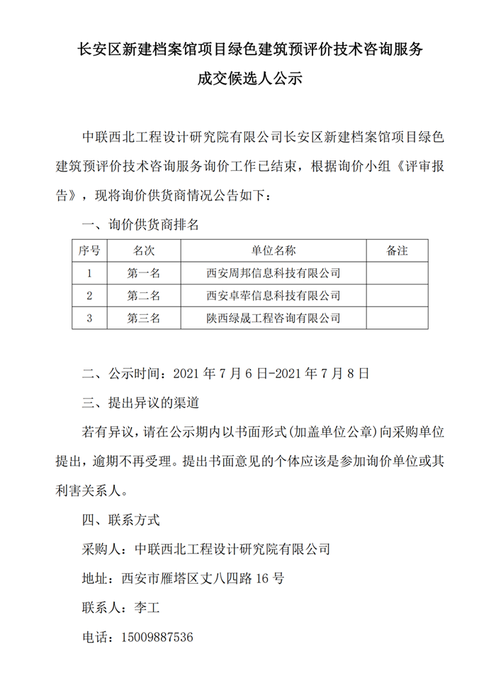 长安区新建档案馆项目绿色建筑预评价技术咨询服务成交候选人公示