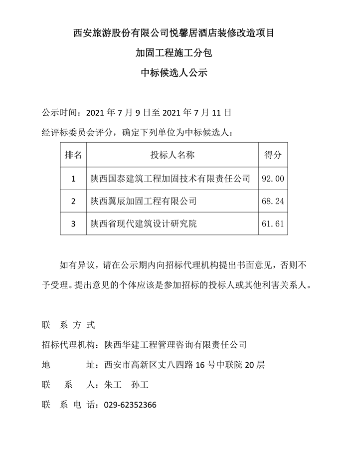 西安旅游股份有限公司悦馨居酒店装修改造项目加固工程施工分包中标候选人公示