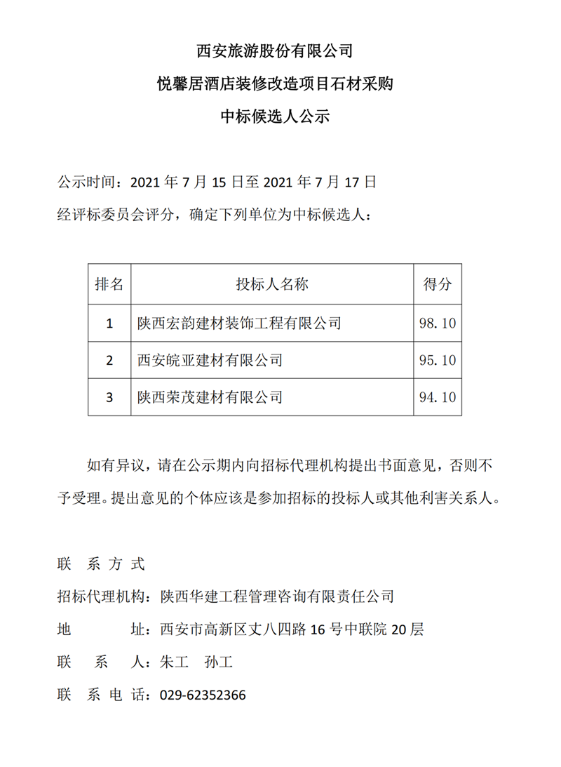 西安旅游股份有限公司悦馨居酒店装修改造项目石材采购中标候选人公示