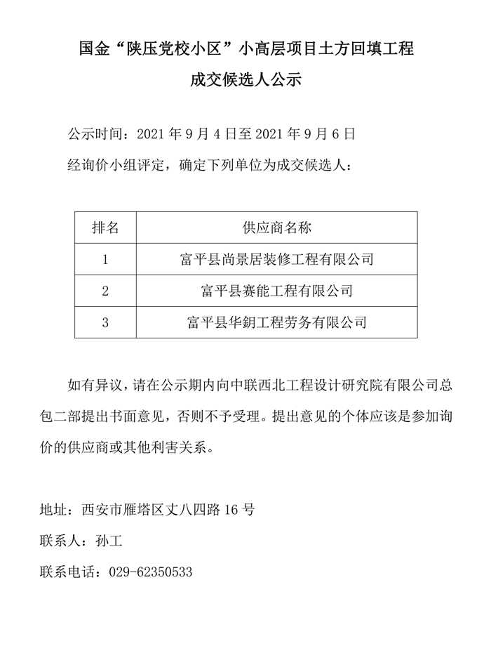 国金“陕压党校小区”小高层项目土方回填工程成交候选人公示