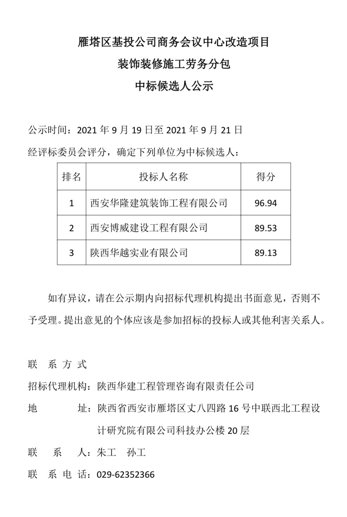 雁塔区基投公司商务会议中心改造项目装饰装修施工劳务分包中标候选人公示