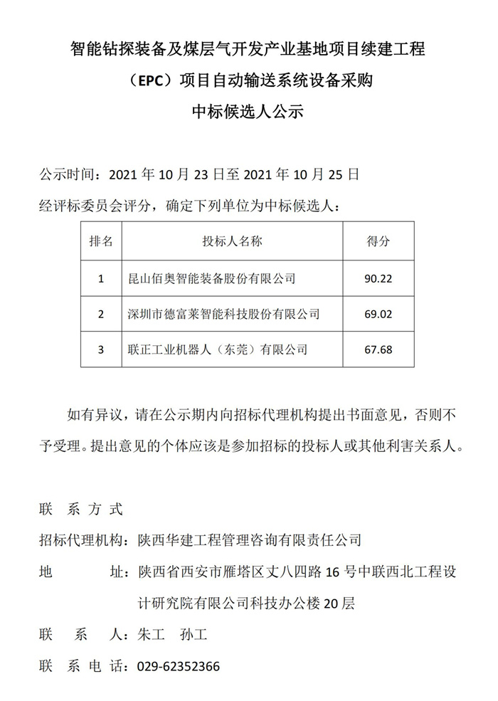 智能钻探装备及煤层气开发产业基地项目续建工程(EPC)项目自动输送系统设备采购中标候选人公示