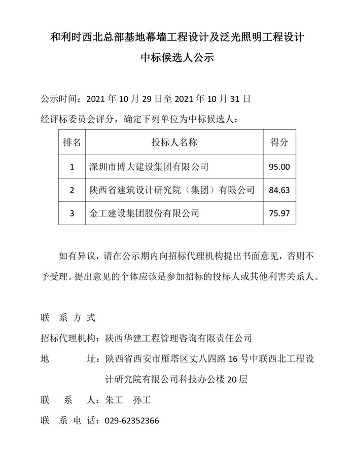 和利时西北总部基地幕墙工程设计及泛光照明工程设计中标候选人公示