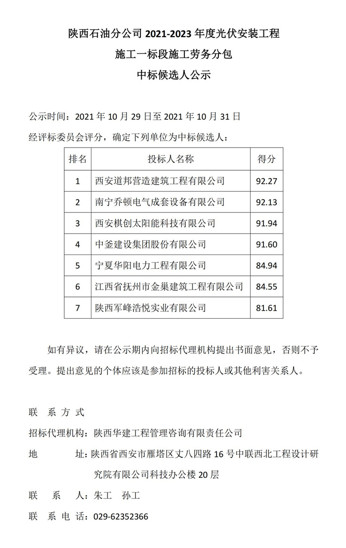 陕西石油分公司2021-2023年度光伏安装工程施工一标段施工劳务分包中标候选人公示
