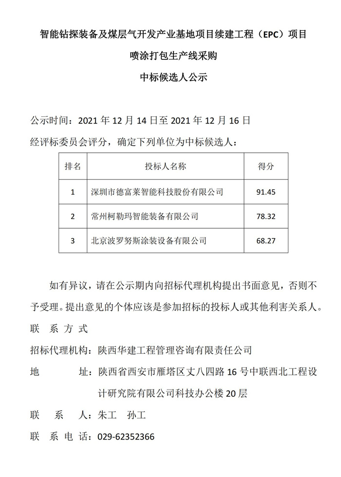 智能钻探装备及煤层气开发产业基地项目续建工程(EPC)项目喷涂打包生产线采购中标候选人公示