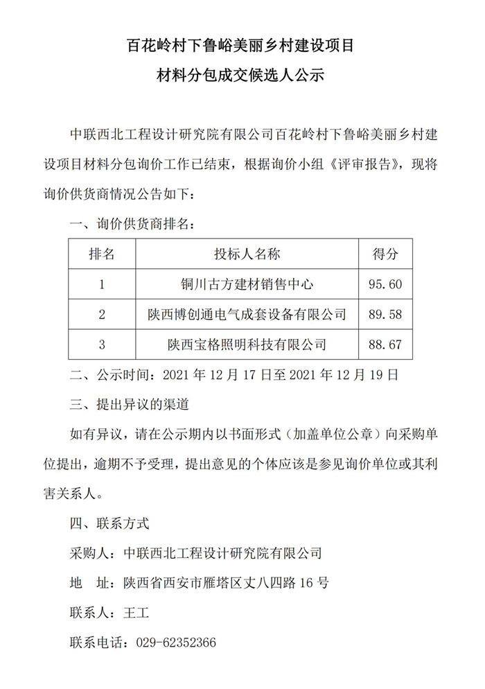 百花岭村下鲁峪美丽乡村建设项目材料分包成交候选人公示