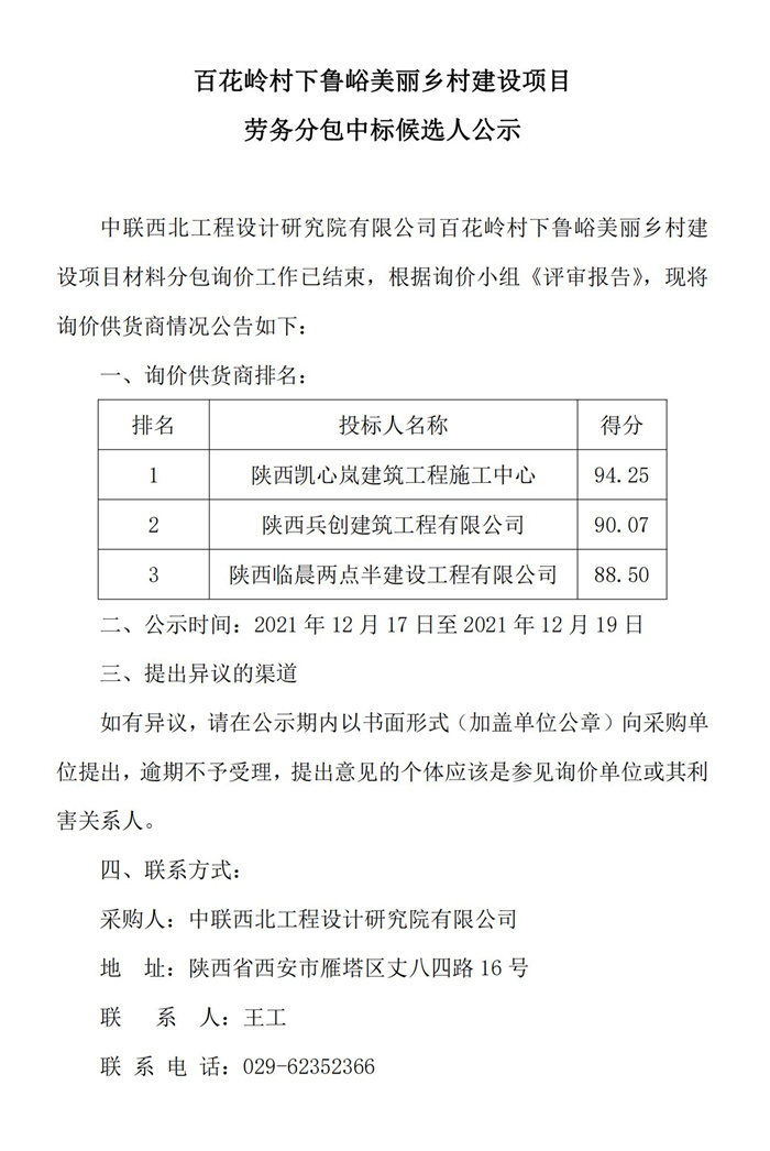 百花岭村下鲁峪美丽乡村建设项目劳务分包中标候选人公示