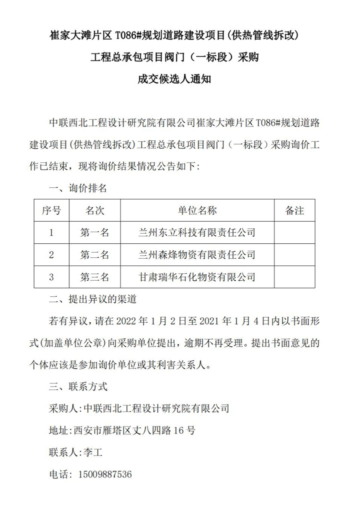 崔家大滩片区T086#规划道路建设项目(供热管线拆改)工程总承包项目阀门(一标段)采购成交候选人通知