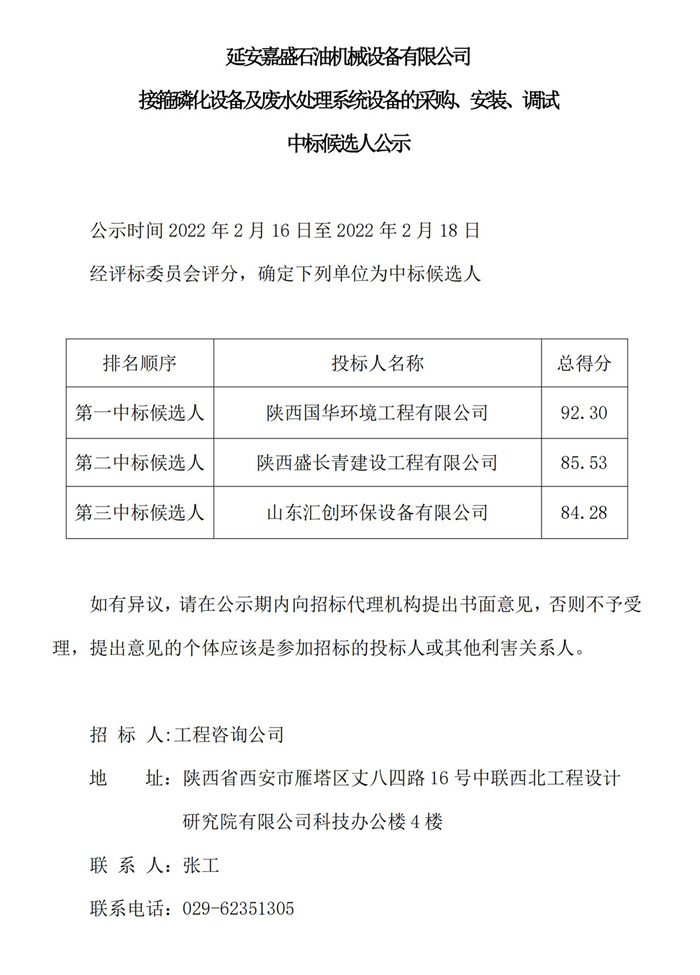 延安嘉盛石油机械设备有限公司接箍磷化设备及废水处理系统设备的采购、安装、调试中标候选人公示