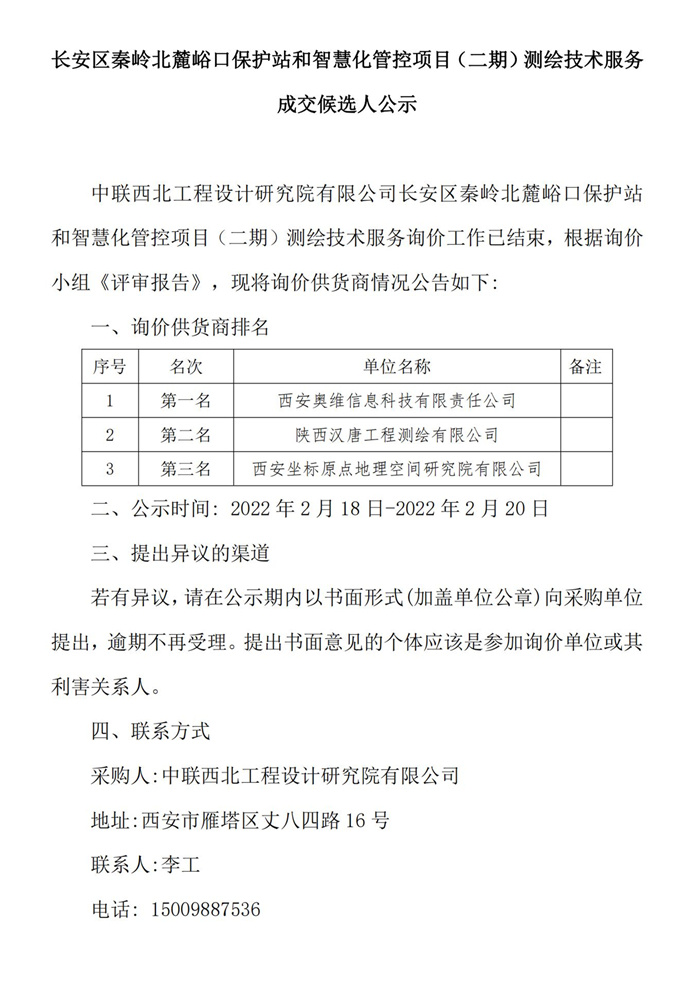 长安区秦岭北麓峪口保护站和智慧化管控项目(二期)测绘技术服务成交候选人公示