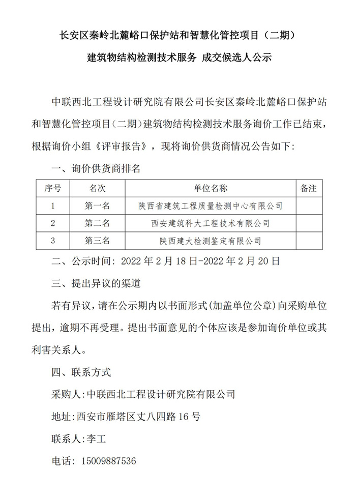长安区秦岭北麓峪口保护站和智慧化管控项目(二期)建筑物结构检测技术服务成交候选人公示