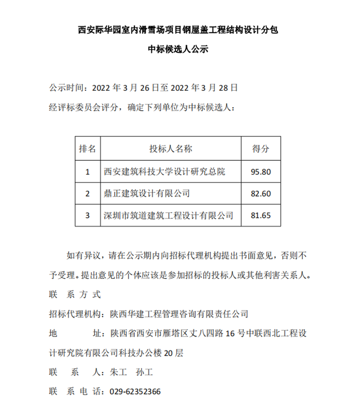 西安际华园室内滑雪场项目钢屋盖工程结构设计分包中标候选人公示