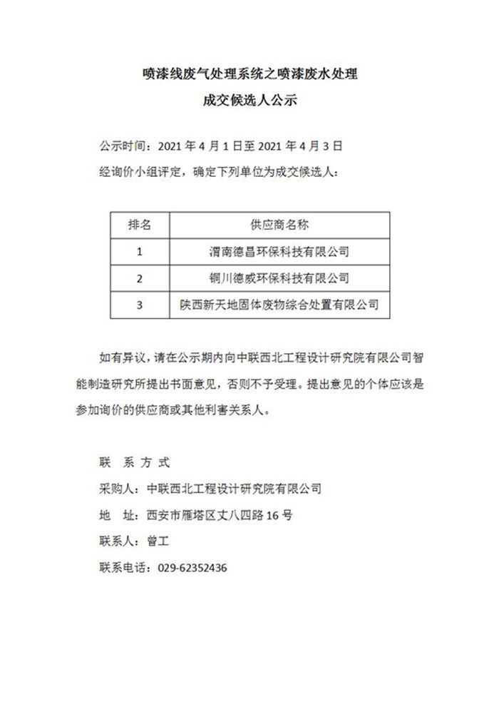 成交候选人公示-喷漆线之过滤系统采购及设备改造