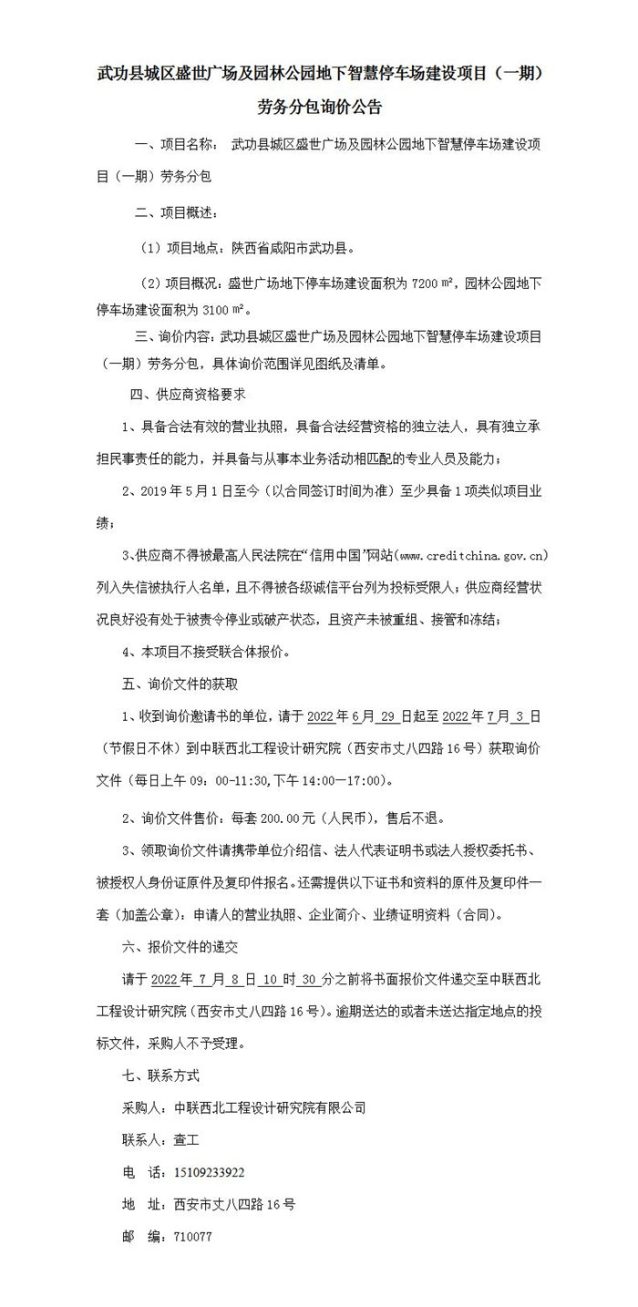 武功县城区盛世广场及园林公园地下智慧停车场建设项目(一期)劳务分包询价公告